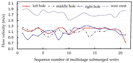 Change process of the flow velocity along the transition reach in Case S2. The velocities of the weir flow at the upper layer and the bottom orifice flow both fluctuated along the reach in the range of 0.4 to 0.6 m/s. The upper velocity in Case S2 was decreased by 0.25 to 0.85 m/s compared to that in Case S1. Therefore, the layer conditions of the flow structures and their flow intensities are both suitable for migrating fish and also contribute to living aquatic plants, reoxygenation, and improved water ecology.