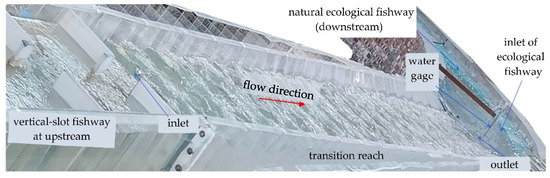 According to the criterion of the gravity similarity and turbulent resistance similarity, a scale model of the fishway with the DWO was designed and built. The transition reach model was made of transparent material so as to observe the flow regime. The finished model of the transition reach is shown in Figure 19, and the local layout is shown in Figure 20. The modeling range was the same as the numerical simulation range. Limited by space, the geometric scale of the model was selected as 10, and the velocity scale and Manning roughness scale were about 3.16 and 1.47, respectively. The flow discharge in the experiment was controlled by an E-mag electromagnetic flow meter, and the flow velocity was measured by a Doppler velocity meter (ADV). In order to investigate the hydraulic and ecological characteristics of the transition reach, the experiments were conducted under the same conditions as the numerical simulation, and the boundary conditions mainly included the two schemes of Case S1 and Case S2. The resistance similarity of the model has been validated.