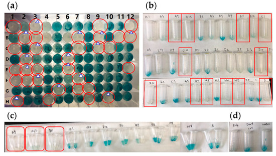 Screening and confirmation of potential AHL-degrading bacteria originating from activated sludge from a local municipal wastewater treatment plant. C8-HLS was used in all screening and confirmation experiments. (a) Screening of potential AHL-degrading bacteria from colonies on LB agar plates; (b) first confirmation of degradation ability; (c) second confirmation of degradation ability; (d) Rhodococcus sp. BH4 was used as a positive control, and autoclave-killed BH4 and water were used as negative controls.