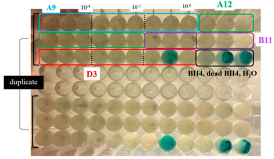 Before final confirmation of C8-HSL-degradation ability, the bacteria were further processed to ensure their purity. Isolates A9, A12, B11, and D3 were cultured in LB broth again overnight. The cell suspension was then serially diluted and then plated on LB agar. Consistent colony morphology, such as shape, color, size, etc., was observed. The colonies of each isolate on plates were serially diluted to form cell suspensions of different concentrations and examined again for their ability to degrade C8-HSL. The result is illustrated in Figure 2. All isolates (except one replicate of 106-fold diluted D3) removed 5 μM of C8-HSL to below the detectable level in the X-Gal bioassay. Meanwhile, the expected results were observed in both the positive control (BH4) and the negative controls (dead BH4 and water).