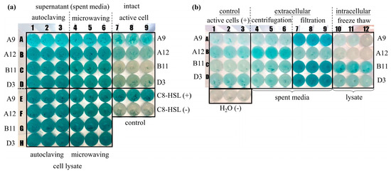 As shown in Figure 4a, wells receiving both autoclave- and microwave-inactivated spent supernatant (extracellular fraction) or cell lysate (intracellular fraction) turned blue, indicating that the C8-HSL was not degraded after the heat treatment. In the wells inoculated with active intact cell suspensions, the C8-HSL was reduced to lower levels, as indicated by the color yellow (original media) or light blue. The outcomes of the positive control (in the presence of C8-HSL) and the negative control (in the absence of C8-HSL) were both as expected. This result supports an enzyme-involved mechanism over inhibition of or interference with bioassays by unknown small molecules.