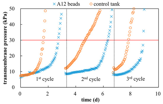 Transmembrane pressure (TMP) monitored in an A12 MBR and a control MBR. When the TMP reached 30 kPa, it was considered the end of the test and new membrane modules were installed for the next cycle. There were three cycles of tests.