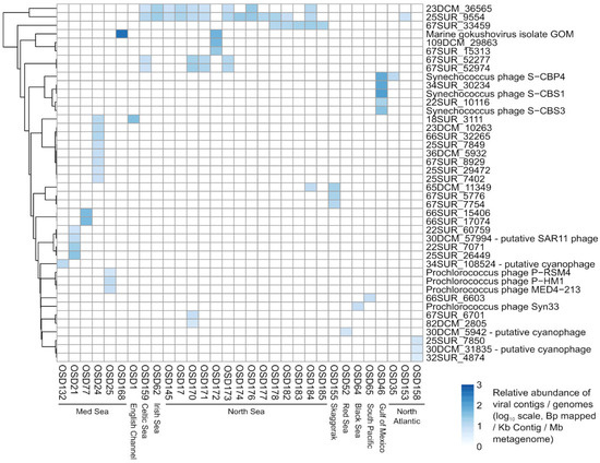 Heatmap of viral sequences abundance (when covered at >75%) across OSD samples. Only metagenomes with at least one viral sequence covered >75% were included.