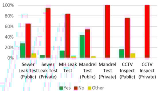 Surveys of municipal staff managing wastewater systems in communities with new subdivisions reporting high rates of I/I indicated that many manufacturer-recommended practices and construction code requirements concerning sewer system construction and inspection were not being conducted [38]. Ongoing surveying of the municipal respondents indicated no testing or very low rates of feeler gauge testing for installed pipe gaskets (0% of ~100 municipalities). The respondents further indicated that, though mandatory, sewer testing methods, including leak testing, mandrel, and CCTV inspections, were conducted infrequently (Figure 1).