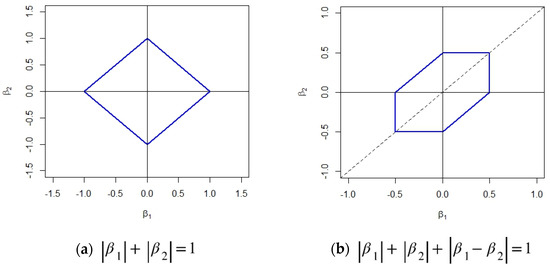 subject to for some , which is a non-negative constant corresponding to . Figure 1 shows the boundaries of regions created by the constraints of lasso and fused lasso penalty function. The non-differentiable points on the boundary give a sparse or grouped solution minimizing .