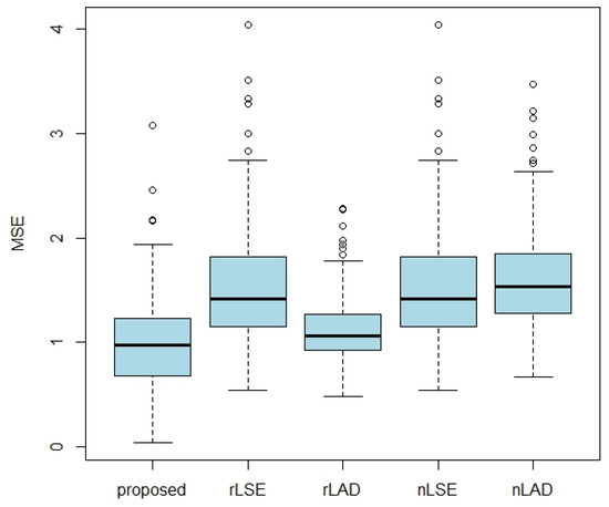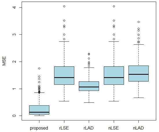 MSE of estimated coefficients of five methods in simulation 2. The five methods are our proposed method(proposed), the naive LSE(nLSE), the naive LAD(nLAD), the rank LSE(rLSE) and the rank LAD(rLAD).