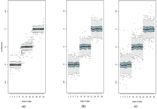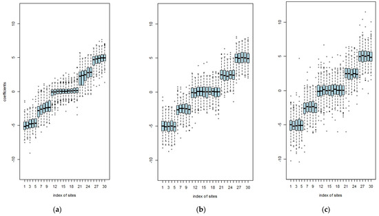 Estimated coefficients of the proposed method (a), rLSE (b) and rLAD (c) in simulation 1.
