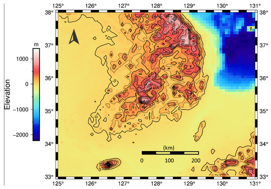 Southern portion of the Korean Peninsula and islands and their elevation (m).