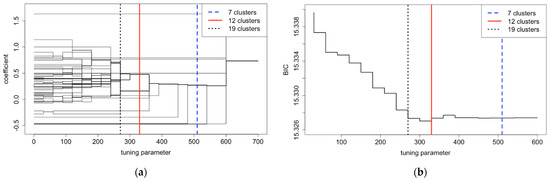 Path of coefficients (a) and BIC plot (b) with respect to tuning parameter .
