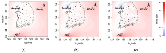Figure 8 summarizes the results that display the trend coefficient on the southern portion of the Korean Peninsula by the Kriging method with Gaussian filter. The trend coefficients illustrated in Figure 8 are estimated with and . Even though the trend maps are different to each other, it is remarkable that the pattern in the increasing trend is separated in western sites and southern sites when the number of clusters grows. Moreover, Figure 8 indicates that weak trends in the western coastal line and the midland are estimated, and strong positive trends in Jeju, which is the largest island in South Korea, and Ulleung, which is an island located 120 km east of the Korean Peninsula, are estimated. As the clusters are subdivided, the negative trend in Ganghwa, which is located in the northwestern end, tends to be clear. Compared to the west site, the east site has a relatively strong and nonstationary trend in heavy rainfall. These results imply that (1) the intensity of heavy rainfall tends to be increasing, and nonstationarity, represented by trend coefficients of the Jeju and Ulleung islands, is more severe; (2) the heavy rainfall trend in the coastal site has distinct characteristics depending on its location; (3) the trend in Ganghwa uniquely shows a negative trend.