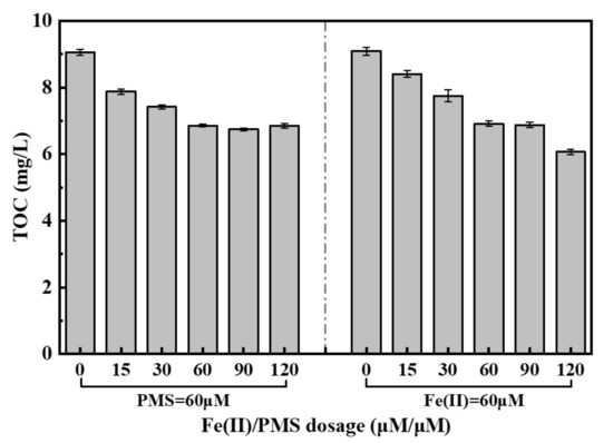 To evaluate the influence of coupled Fe(II) and PMS with different molar ratios on the optimization of raw water quality, the water quality before UF membrane permeation was determined and the concentration of organic components (TOC) after administration is illustrated in Figure 2. When the PMS concentration remained at 60 μM, and the Fe(II) concentrations were set at 0, 15, 30, 60, 90, and 120 μM, the average TOC concentration decreased from 9.06 to 7.88, 7.42, 6.86, 6.74, and 6.86 mg/L, respectively. TOC gradually decreased with Fe(II) dosage, but decreased indistinctively when the Fe(II) concentration rose to 60 μM. This is owing to the oxidation of Fe(II) into Fe(III) by the presence of PMS. The in situ formed Fe(III) acted as a coagulant, was hydrolyzed, and eventually formed positively charged complexes under neutral conditions, which strongly interacted with negatively charged colloidal substances and then agglomerated into larger particles or flocs, followed by interception and removal in the subsequent membrane process [29,30,31].When Fe(II) concentration was fixed at 60 μM, the PMS concentrations varied in the range of 0, 15, 30, 60, 90, and 120 μM, TOC concentration turned out to be 12.09, 10.41, 10.15, 9.00, 8.48, and 8.07 mg/L, respectively. TOC gradually decreased with the PMS dosage. This phenomenon was due to the fact that PMS acted as an oxidant, converting macromolecular organics in the secondary effluent into small molecules or mineralized pieces [15,32]. The experimental results could also indicate that under the same molar dosage of Fe(II) and PMS, the coupling function led to better removal efficiency of organic matter than the individual application. The effect of 90 μM coagulant was slightly superior to that of 60 μM coagulant, but high doses of coagulant may lead to secondary pollution due to excessive residual iron content in the effluent. Iron residue may cause the water to darken and be unacceptable to the public [33]. Therefore, the follow-up evaluation of the coupling effect for the system and the membrane treatment was carried out under the optimal molar ratio of 1:1.