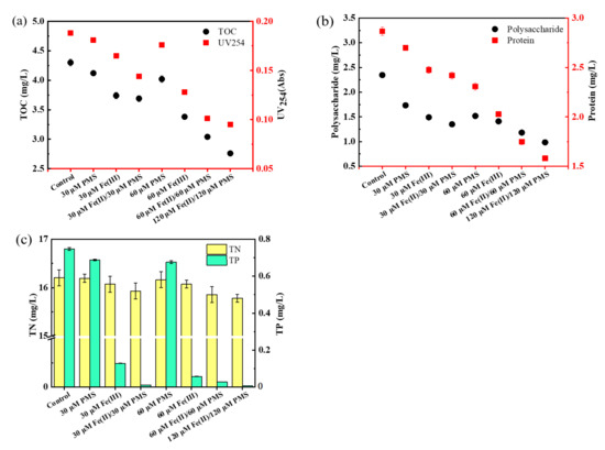 However, the concentration of TP was greatly affected by dosing, and especially in groups with 30/30, 60/60, and 120/120 μM/μM Fe(II)/PMS, the removal rate of TP compared with raw water can reach 98.7%, 96.5%, and 99.2%, respectively. It can be seen from the results that the synergistic pretreatment of Fe(II)/PMS had a good removal effect on TP, and coagulation played a major role. As reported by Liu et al. [46], the combination of coagulation and ultrafiltration could remove about 80% of phosphorus. The iron salt was hydrolyzed to form a variety of polymeric cations, which reduced the zeta potential of the particles and promoted instability. The greater amount of iron coagulant dosage triggered the better phosphorus removal efficiency [47]. Phosphorus was removed through a combination of charge neutralization, bridge formation, and scanning solidification mechanisms [48]. As the oxidant in the system, PMS can achieve a phosphorus removal efficiency of about 10%, compared with the control group. The combination of the two can reduce the phosphorus concentration to a trace amount, meeting the TP discharge standard for domestic surface water [49].