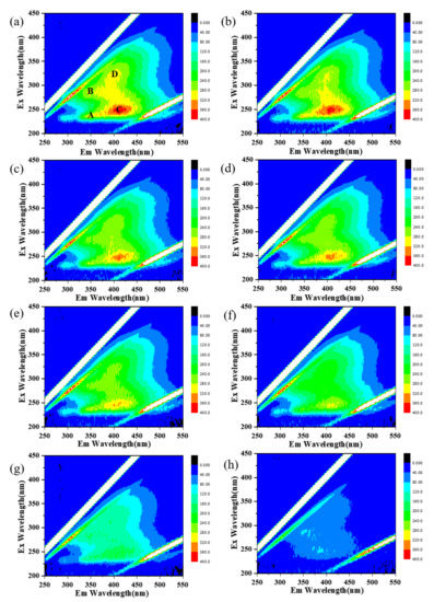 Fluorescence EEM spectra of organic matters in the permeate water of UF under different concentrations of Fe(II)/PMS: (a) control; (b) 30 μM PMS; (c) 60 μM PMS; (d) 30 μM Fe(III); (e) 60 μM Fe(III); (f) 30/30 μM/μM Fe(II)/PMS; (g) 60/60 μM/μM Fe(II)/PMS; and (h) 120/120 μM/μM Fe(II)/PMS.