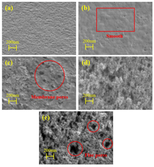 The pretreated UF membrane was placed face up at the bottom of the ultrafiltration cup. An amount of 300 mL of the water sample to be filtered was taken and put into the ultrafiltration cup, and filtered under pressure. The backwashing water was ultrapure water of 200 mL, and the backwashing pressure was 0.1 MPa. In the experiment of measuring membrane flux, each ultrafiltration membrane was filtered for three cycles. When conducting experiments related to membrane characterization, in order to ensure that the surface morphology of the membrane was not damaged, only one cycle of filtration was performed, including ultrapure water filtration and water sample filtration.