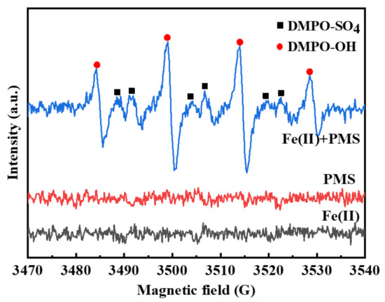 Electron paramagnetic resonance (EPR) spectroscopy (A200S-95/12, Bruker, Germany) was used to detect free radicals •OH and SO4•− formed in the Fe(II)/PMS system and 5,5-dimethyl-1-pyrroline-N-oxide (DMPO, 97%, MACKLIN) was used as a spin-trapping agent. Then, 1 mL of standard sample and 50 μL of DMPO were prepared. The spectroscopy settings included a microwave frequency of 9.852 GHz and microwave power of 7.290 mW.