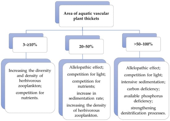Aquatic vascular plants are known to serve as a refuge for zooplankton [,]. Shallow lakes support higher zooplankton densities within or close to the areas overgrown with aquatic vascular plants during the day []. Given that most species of zooplankton are herbivorous, increased densities of zooplankton will decrease cyanobacteria abundance. Many authors note that the high species richness and development of high densities of zooplankton in dense beds of submerged aquatic plants [,,,], and their exometabolites (phenolcarboxylic acids) stimulate Daphnia magna Straus fertility []. However, it should be noted that helophytes and floating leaf plants create poorer physicochemical conditions for the development of large populations of aquatic animals compared to submerged plants [,]. In addition, cyanotoxins produced by blue-green algae are released in large quantities and can adversely affect zooplankton. Thus, this indirect mechanism does not always play an important role.