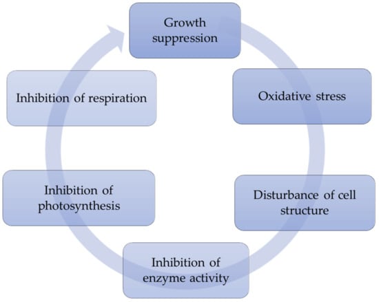 Allelopathically active compounds, as well as other stressors, affect a number of physiological and biochemical processes in phytoplankton species (Table 2), including water bloom agents, and thereby limit their growth and development (Figure 3) [,,,].