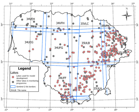 There are 357 lakes and ponds included in the national monitoring programme in Lithuania. They are covered by 11 Sentinel-2 tiles (Figure 1). Most of the lakes are larger than 0.5 km2.