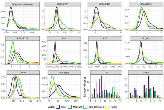 The distribution of 12 features by biophysical class (Clear, Moderate, Chla-dominated, Turbid). The features found in the first and the second row are dimensionless, except Eq_BD2—that is the concentration of chlorophyll α in mg/m3. The unit of Apparent Visible Wavelength (AVW) nm, the unit of hue angle—degrees, FU—the class as from Forel-Ule colour scale, and the last one is the number of months of an observation.