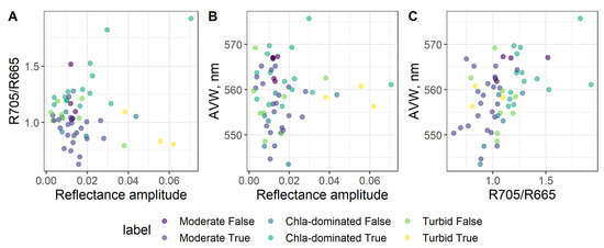 The scatterplots of features (A) reflectance amplitude and R705/R665, (B) reflectance amplitude and Apparent Visible Wavelength (AVW)), and (C) R705/R665 and AVW of correctly classified (Moderate True, Chla-dominated True, and Turbid True) and incorrectly classified (Moderate False, Chla-dominated False, and Turbid False) by Random Forest (RF) classifier observations. The reflectance amplitude and R705/R665 are dimensionless and AVW is expressed in nanometres.