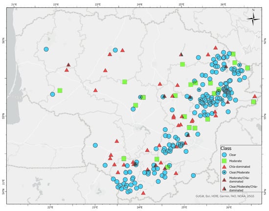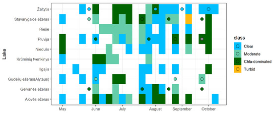 The Chla-dominated class is likely related to algal blooms. This class was prevalent in 42 lakes and in 20 of those lakes the prevalent class obtained from satellite data and RF models was the same for the six-year period. In these lakes every year this class was attributed from 40 to 100% of observations showing the different length of algal blooms in these lakes. In several lakes there was very little of change of class (Lake Ūdrijos, Lake Didžiulis (Dusmena), and Petraičių pond)—in all years in the spring to autumn season these lakes were characterised by algal blooms (89–100% of observations assigned to the Chla-dominated class). More class changes were observed in other Chla-dominated lakes. In others, yearly class change was observed and in 45% of these lakes other classes than Chla-dominated were observed in the year of 2020. There were from 6 to 19 observations in these lakes in the year 2020 (Figure 6). In some lakes in spring and autumn there was the Chla-dominated class, while in summertime we observed the Clear and Moderate classes (Lake Niedulis), that in some cases did not reflect in situ measurements (Lake Pluvija). The RF models likely misclassified lake classes in summertime in these lakes.
