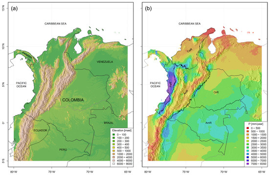 Location of the study area. The maps correspond to (a) the elevation of Colombia and (b) the mean annual precipitation. Also in pannel (b), the continental natural regions of Colombia are depicted: the Caribbean region (CaR); the Pacific region (PaR); the Andean region (AnR); the Orinoco region (OrR); and the Amazon region (AmR).