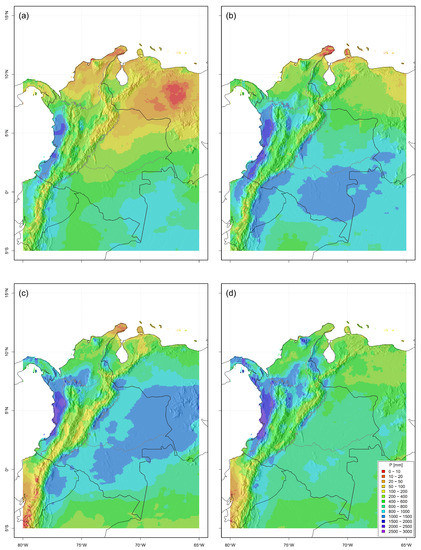 Most of the studies that analyse climate change scenarios are focused on annual averages. However, the inclusion of daily data, although more difficult to process, provide insights related to the extreme precipitation events, which are responsible for a large part of the environmental and social damage attributed to the climate [14,15]. Despite their importance, these observations are less frequent and, thus, more difficult to acquire. In this sense, data-scarce regions, such as Colombia, lack of dense networks of meteorological stations, which hinders the spatio-temporal characterisation of precipitation [16]. However, several precipitation products (P products) provide estimates related to the spatio-temporal distribution of precipitation, which enables the analysis of precipitation extremes over data-scarce regions [17,18,19,20,21,22,23].