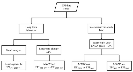 The study goal is to evaluate the long-term change of EPIs and the anomalies of these series during the ENSO extreme phases. For that, the methodology in Figure 3 was followed, which can be summarized as follows: