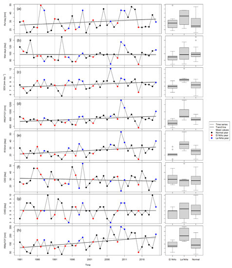 Time series of EPI in Table 1 were built over each grid-cell of the daily CHIRPSv2 in the study area, using the R library climdex.pcic [59]. Figure 4 shows the temporal behaviour of the selected EPIs over a particular grid-cell (located in Bogotá city—4°3646 N–74°0414 W). This figure depicts the NOY, NAY, and NOR as red, blue, and balck dots, respectively. In the right panel, box plots of the respective EPIs separated according to the ENSO phases are shown.