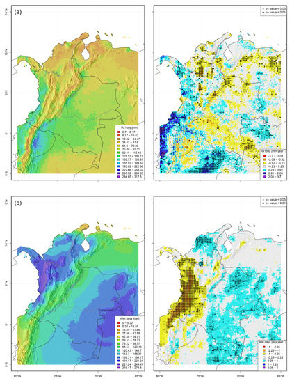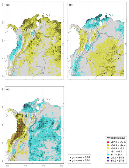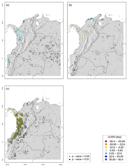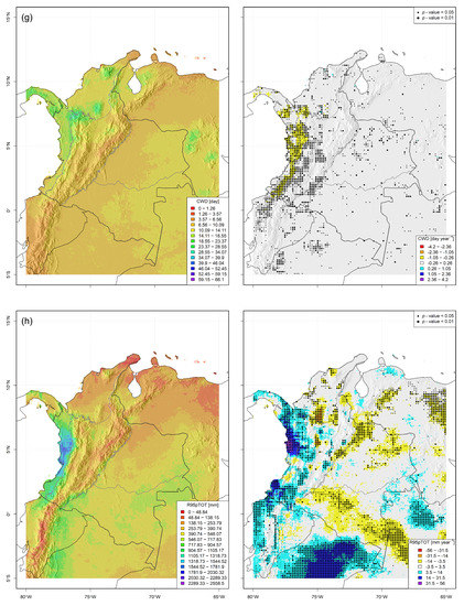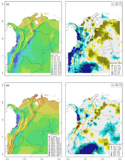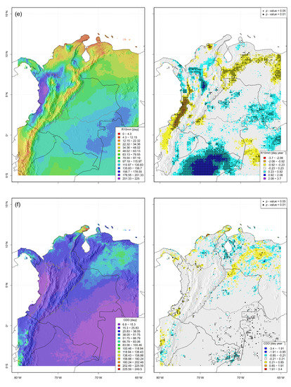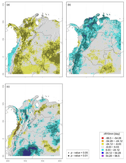 The maps for are presented in Figure 7c. The EPI’s negative and significant LTC are gathered in western Colombia (on the PaR): in a large area of this region, there were reductions of wet days with a magnitude greater than 25 days. Furthermore, adjoining the foothills of the Cordillera Occidental de Colombia (Colombian Western Mountain Range), the number of wet days reduced by up to 68 days. On the other hand, positive and significant LTC of this EPI occur in eastern Colombia (i.e., OrR + AmR), and the central CaR. Precisely in CaR, the largest magnitude of the positive LTC is presented.