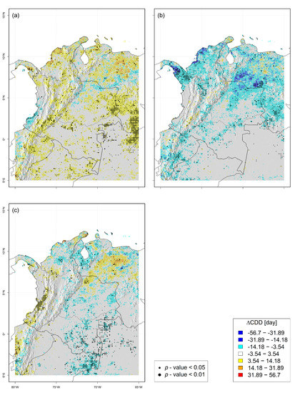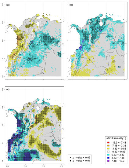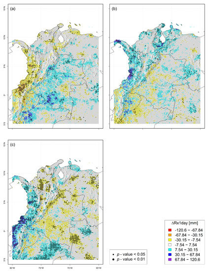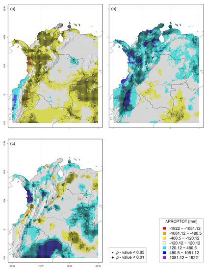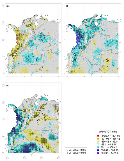 For PRCPTOT, the most important positive LTC occurs in the northernmost of PaR ( > +1000 mm); at the same time, the most important negative LTC occurs at the south of PaR ( < −480 mm). The positive and significant change observed in the Peruvian Amazon, in the center of AnR, and the easternmost of Colombia, around the triple border with Venezuela and Brazil, should be highlighted too. The maps constructed for are shown in Figure 9c.