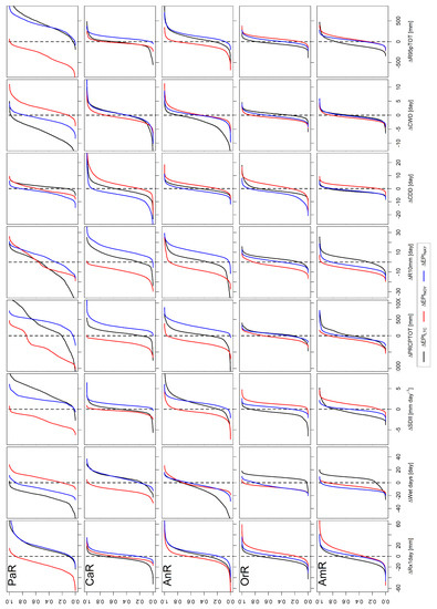 The EPI R10mm shows that the most important positive LTC occurs in the boundary between AnR and CaR ( > 25 mm) and on the Peruvian Amazon. The largest negative LTC for R10mm is located in the south of PaR, in a relatively narrow zone near the foothills of the Cordillera Occidental. The map depicting the LTC is shown in Figure 10c.