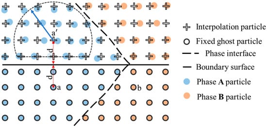 For multiphase flows, it is important to predict the dynamic viscosity near the boundary to solve the viscous term in Equation (3). The viscous force provided by the boundary force is calculated based on Equation (24). The viscosity of ghost particle plays a key role in calculating the viscous force provided by the boundary surface. The viscosity of ghost particle is calculated based on the rheological model of the different phase. The value of is used to determine the rheological model of the ghost particle. As shown in Figure 3, the value of can be divided into the contribution of phases and . If , then the viscosity of ghost particle is calculated based on the rheological model of phase A, as shown for particle a in Figure 3; if , then the viscosity of ghost particle is calculated based on the rheological model of phase B, as shown for particle b in Figure 3.