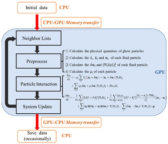 Particle-based methods are often criticized for their high calculation costs [47,48]. Different parallel computing architectures such as MPI [28], OpenMP [49], OpenCL [50], and CUDA [51] are commonly used to alleviate this drawback. Among these parallel computing architectures, CUDA is the most popular framework that can take advantage of the GPU’s computational horsepower. In the present work, we develop a CUDA-based parallel implementation on GPU architecture of the multiphase δ-plus-SPH model. As shown in Figure 4, the model can be split into four main steps: (1) building neighbor lists; (2) computing the physical quantities of ghost particles and the auxiliary variables of fluid particles; (3) solving the momentum and continuity equations; (4) and updating the physical quantities of the fluid particles.