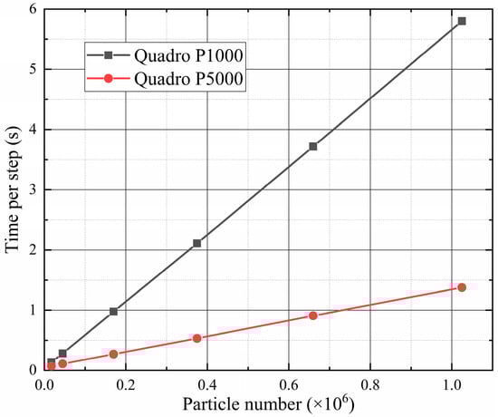The performance of the GPU implementation was evaluated by increasing the spatial resolution of the static tank case (See Section 5.1 for details). Each case was run on two GPU cards, namely an Nvidia Quadro P1000 and Nvidia Quadro P5000. The relationships between calculation time per step and particle number are described in Figure 6. It shows that the calculation time per step increased linearly with the particle number. The ratio of the scalability (defined as the slope of the line) between the Quadro P1000 and Quadro P5000 was 4.33 for calculation time per step.