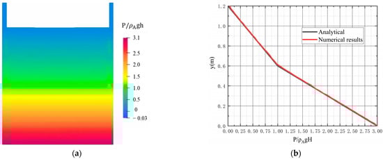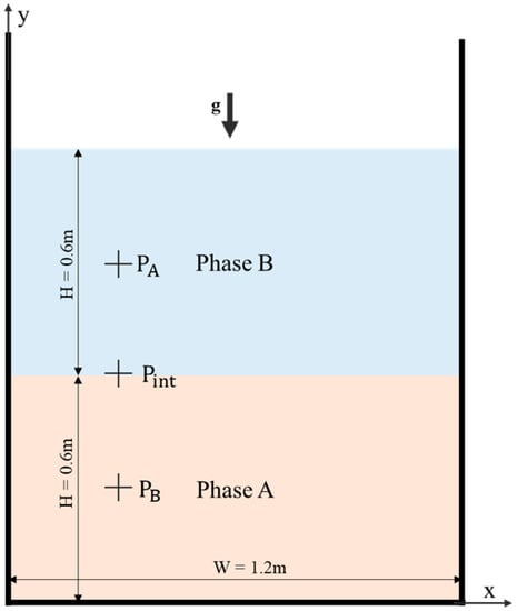 We considered a 2D 1.2 m × 1.5 m static tank, as presented in Figure 7. The static tank contained two horizontal layers of fluid. The height of each layer was 0.6 m. Three pressure monitor probes , , and were arranged to record the pressure evolution during the numerical simulation. The physical and rheological parameters of each phase are listed in Table 1. The gravitational acceleration g was set as (0, −9.8).