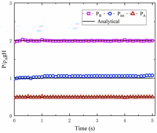The pressure field of the static tank at t = 3.5 s is given in Figure 8a. The present pressure field obtained by the multiphase SPH model was smooth and continuous. Boundary particles could obtain proper pressure values via MLS interpolation. The pressure profile in the middle of the tank is presented in Figure 8b. In general, the numerical pressure profile was consistent with the analytical profile. There was a little deviation near the free surface owing to the backpressure used in the equation of state. Due to the SPH approximation feature, the evolution of numerical pressure near the phase interface was smoother than the evolution of the analytical pressure. The pressure history of the three monitor probes is presented in Figure 9. The results show that the numerical pressure values of each probe reached a steady state at 1 s. The numerical pressure of each probe thereafter agreed well with the analytical values.