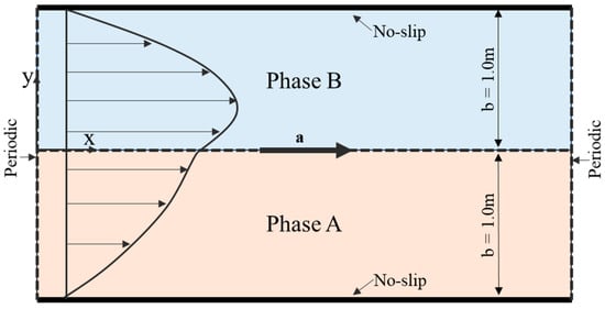 Poiseuille flows are used to validate the accuracy of the discretization scheme of the viscous term in a momentum equation. Two 1.0 m wide immiscible incompressible fluids were placed in the flow channel, as shown in Figure 10. The channel was limited by two fixed walls. No-slip boundaries were applied in the fixed walls. Periodic conditions were applied in the streamwise direction to produce a virtually infinitely large flow field. The fluids were driven by a constant body force . The density values of the two fluids were . Two test groups were investigated to simulate Newtonian/Newtonian interactions and Newtonian/non-Newtonian interactions.