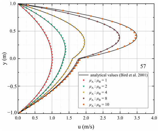 In the first test group, both phases were Newtonian fluids. The dynamic viscosity of phase A was set as = 1.0 Pa∙s. In the different test cases, the dynamic viscosity of phase B was varied from 1.0 to 0.1 Pa∙s. Bird et al. [57] proposed an analytical solution for the velocity profile of two Newtonian fluids in the steady state.