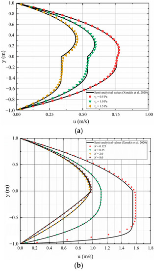 In the second test group, phase A was set as the non-Newtonian fluid and phase B was set as the Newtonian fluid. The dynamic viscosity of phase B remained 1.0 Pa∙s. For the non-Newtonian phase A, the parameters changed between different cases. K remained 1.0 Pa∙sN in different cases. For the power law fluid cases, was equal to 0 and N varied from 0.125 to 8. For the Bingham fluid cases, N was equal to 1 and varied from 1 to 1.5 Pa. Xenakis et al. [16] proposed a semi-analytical solution for the steady state velocity profile of two-phase Newtonian/non-Newtonian Poiseuille flow.