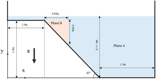 In the present work, the study conducted by Rzadkiewicz et al. [58] was simulated to examine the proposed multiphase SPH model. The geometrical configuration of the experimental setup is presented in Figure 14. The experiment was conducted in a 4 m × 2 m tank. Phase A was water and the maximum water depth was h = 1.6 m. Phase B was the mud mass, 0.65 m × 0.65 m in cross-section. The solid mass slid down along a slope of 45°. The rheological and physical parameters used in the simulation are presented in Table 2. The rheological parameters of phase B were chosen based on the numerical tests conducted by Capone et al. [65].