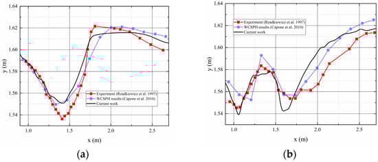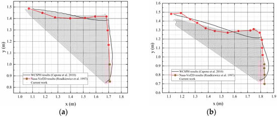 The generated surge wave profiles at t = 0.4 and 0.8 s were compared with the experimental data [58] and the WCSPH computational results [65]. The generated surge wave profile was found to be in accordance with the experimental data at t = 0.4 s, as shown in Figure 17b. The calculated profile could reflect the experimental data well when x < 1.5 m. However, similar to the results obtained by Capone et al. [65], the proposed method overpredicted the free-surface profile when x > 1.8 m. Comparisons were also made for mud mass between the results from the current work, the Nasa-Vof2D computational results [58], and the WCSPH computational results [65], as shown as Figure 18. The configurations of mud mass obtained in the current work were in good agreement with the Nasa-Vof2D computational results [58].