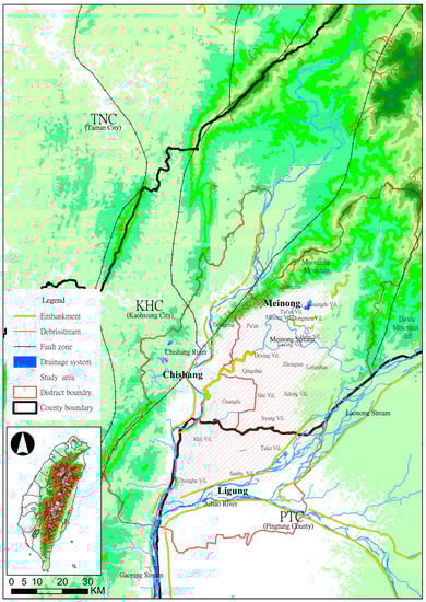 The study area is located at the northernmost end of the Pingtung Plain in Southern Taiwan, in the center of Kaohsiung City and the northernmost plain of Pingtung County. As the plain is located between a fault zone and a trench, it forms a complete geographical area [,,]. The geographical scope is to the east of Chishang River, to the north of the Ligung Embankment, to the west of Dawu Mountain cliff, and to the south of Moonlight Mountain. It is an independent plain isolated by the natural environment. The administrative area includes Ligung Township in Pingtung County, Meinong District, and the Chishang District in Kaohsiung City (Figure 2). The total area of the Meinong Plain is approximately 106 km2, as shown in Figure 2. The formation of its range comes from the coupling of special geographical conditions, which are the Laonong Stream, Chishang River, and Meinong Stream alluvial fan and alluvial plain.