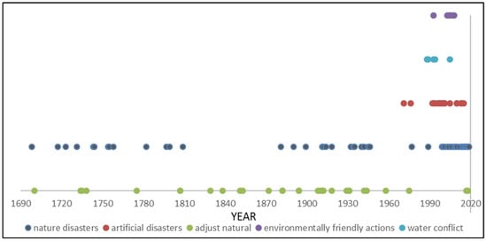 According to the research design, this study began with an investigation of: (1) natural disaster data in historical documents (mainly water and soil disasters); (2) how regional residents altered nature to meet their survival needs (mainly irrigation waterways); (3) artificial disasters (mainly public pollution and environmental movements, such as the anti-Meinong reservoir and the anti-Jiyang artificial lake (after the artificial lake project was rejected in 2013, the government reintroduced the new project and named it Gaoping Great lake; in this study, it is called Jiyang artificial lake) movements in 1992); (4) water conflicts (such as the well sinking in Ligung in 1975, the well closure and power shut-off in Ligung in 1990, and the anti-deep-water well in Meinong District in 2015–2017); and (5) environmentally friendly actions (such as young men returning home for farming, organic farming and environmental protection). All the collected data were classified and coded with Excel software. There were two main sources of data. The first was secondary literature on natural disasters, including data on (1) and (2), which were mainly from research reports and research papers; the second source comprised data on (3), (4), and (5), which came from official and institutional information, official statements, internal meeting minutes, research reports, planning reports, survey reports, etc. Historical water conflict events and management organization data were also collected. Sources included newspapers, magazines, and social media, as well as various planning reports and statistical data from the Ministry of Economic Affairs (MEA) and the Taiwan Water Company (TWC) and its related sub-organizations. In addition, announcement information, planning reports, and meeting records were collected from the Pingtung County government. The interview records from various agencies represented unofficial opinions and descriptions. Data analysis was conducted with Excel statistics software on 54 natural disaster incidents, 35 adjusted natural incidents, 11 water conflict incidents, 26 artificial disaster incidents, and 7 environmental action incidents (Figure 3).