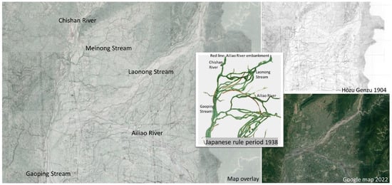 In 1736, the Hakka ethnic group reclaimed land from the high ground at the foot of the mountain and irrigated it with Zhongzhenpi on the plain. After it was stable, it was gradually expanded to the Moonlight Mountain at the upstream of the Meinong Stream to form Meinong and other villages. The Meinong Plain was maintained in a stable state by the Hakka ethnic group. In the early 20th century, a large number of immigrants entered the Meinong Plain after the Japanese government built the Ailiao River embankment []. Before the embankments of Ailiao and the Laonong Stream were built, the streams flowed to the southwest. One can imagine that if heavy rain caused flooding, it would be difficult for the whole north Pingtung area to survive. After the embankment was built, the waterway of the Ailiao River was restrained to the north while the braided river of the Laonong Stream was restrained to the south (Figure 4), converging to Gaoping River []. After the construction of the embankment, the riverbed of Laonong Stream became reclaimed land, which is now Sojingliao Farm and Tuku Farm (also the main area in of cases 4 and 5), Kaohsiung Farm, and the Shingo area.