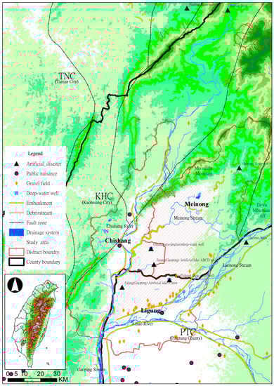 The area of this study has received attention from the humanities and nature perspectives, but no previous studies have explored the relationship between the two simultaneously. In terms of humanities, the Hakka people’s reclamation and development have formed a special social group. As many as 93.5% of the Hakka people in Meinong District (Table 1) are characterized by a high level of education, a strong sense of national identity, and strong political and cultural influence [,]. The geographical space where the settlement is located is also a high disaster-risk area. This area has a maximum water output of surface and groundwater (including underlying water), as well as natural energy due to the intersection of a fault zone, uneven rainfall, and typhoons [].