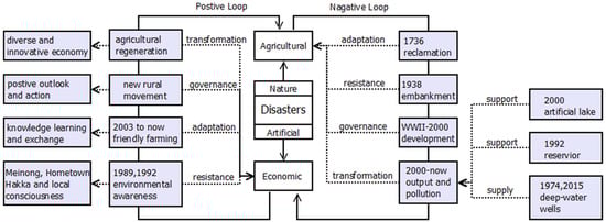 However, the disaster data in this study area showed that, because the three watersheds affect the alluvial plain, they are no longer a single catchment, which may explain the causes of the natural disasters. Moreover, the types of disasters in the study area have changed, and the factors of the disasters are complex and feed back into each other. The current research results also lack insight into how social–ecological systems learn to resist, absorb or adapt to disasters from the diachronic time axis. Therefore, it is necessary to study the actions and feedback of communities experiencing disasters from the perspective of social–ecological systems. Scholars have proposed four aligned suggestions: learning to live with change and uncertainty, nurturing diversity for reorganization and renewal, combining different types of knowledge for learning, and release and reorganization [].