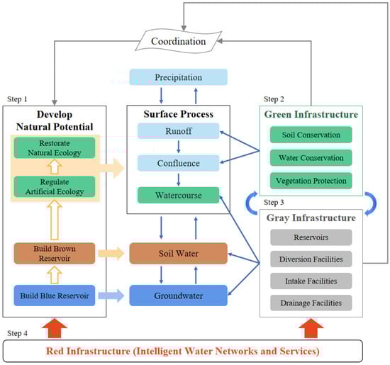 In the context of the “Sixteen Chinese-characters”, scholars have carried out extensive research at the micro-practice level [,,,,]. Among them, Yan et al. [] put forward the “Sponge-Smart River Basins” (SSRB) measures for watershed management and improve the water carrying capacity (see Figure 2).