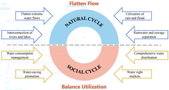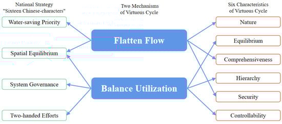 The Virtuous Cycle is closely related to the China’s “Sixteen Chinese-characters” national strategy, which is a response and complement. “Flatten Flow” embodies the national strategy of “Systematic Governance” and “Spatial Equilibrium”, and is the basic carrier for realizing a Virtuous Cycle of natural, comprehensive, and secure water resources. “Balance Utilization” represents the national water management strategy of “Saving Priority”, “Spatial Equilibrium”, and “Two-Handed Efforts”, and is the main driving direction to realize the Virtuous Cycle of balanced, hierarchical, and controllable water resources (see Figure 5).