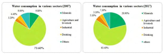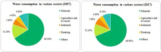 As shown in both figures, the proportion of water consumption in mining and industrial activities tends to increase, whereas in agriculture, livestock and drinking water, consumption rate tends to decrease in both regions.